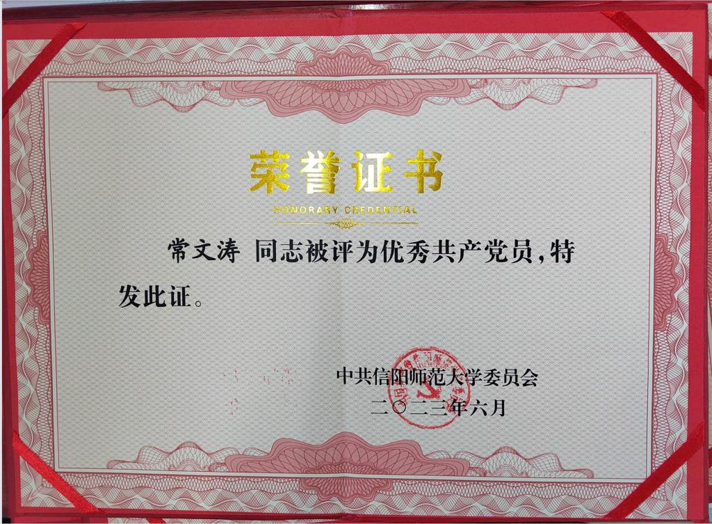 2023年6月,3044am永利集团3044noc黄煌同志被评为信阳师范大学优秀党务工作者;3044am永利集团3044noc李蕊、厉有国、常文涛、王帆宇、高小佳同志被评为信阳师范大学优秀共产党员;3044am永利集团3044noc本科生于嘉宁同志被评为优秀共产党员。