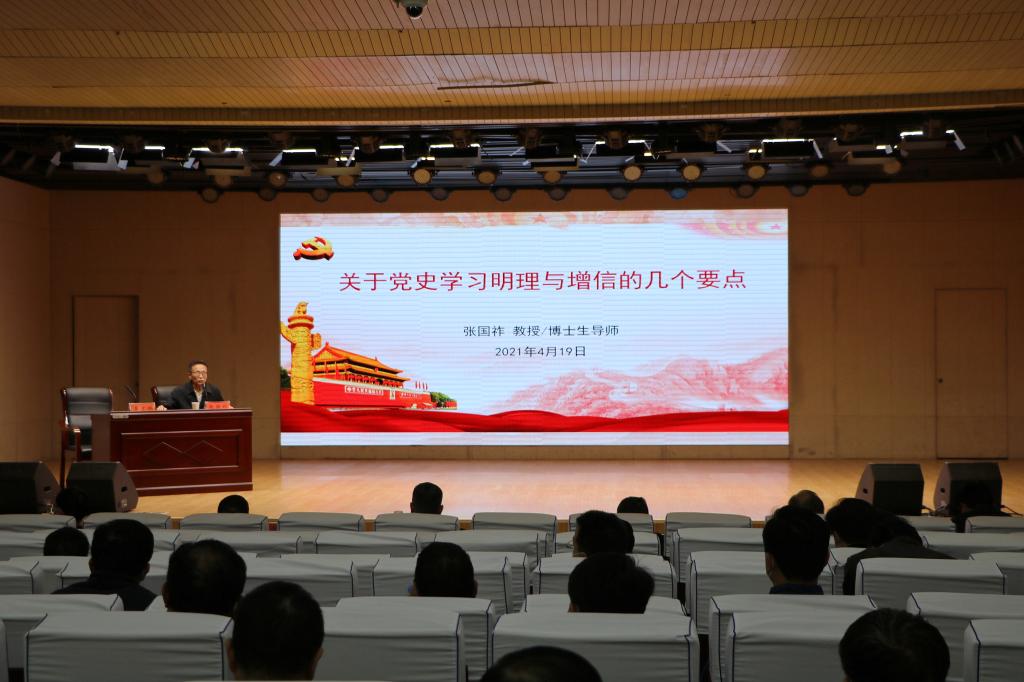 4月19日下午,应3044am永利集团3044noc和当代马克思主义研究所邀请,湖南大学张国祚教授莅临永利官网讲学。为推进全校党史学习教育活动的深入开展,应学校党委邀请,张国祚首先在理科楼报告厅为全校处级以上干部作了题为“关于党史学习明理与增信的几个要点”的学术报告。校党委理论学习中心组成员、全体处级干部、永利官网师生代表共300余人共同参加了本次报告会。