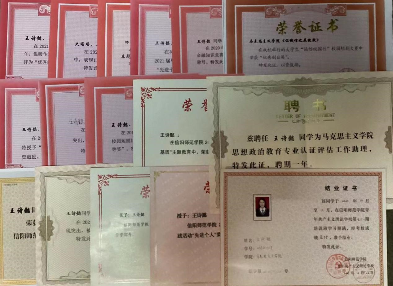 在学习方面,该生勤奋刻苦,善于思考,坚持练就过硬本领,努力提高科学文化水平,时刻把学习当作自己的第一任务,积极投入到各门基础课和专业课的学习中,并不断提高自身写作能力,积极撰写《在抗疫中书写奋斗青春》、《以高尚人格增添思政课教师魅力》等文章,并在《南湖评论》上发表。2019-2020学年荣获校级三等奖学金,顺利通过英语四级考试、普通话水平测试。不仅注重专业知识学习,而且注重提升综合能力,积极参加广播体操比赛、微团课比赛、南湖理论研讨社主题征文活动、学生会夜跑活动、“丹青墨韵”摄影美术作品大赛、仁杰工作室笔锋征文活动,参演了新生联谊晚会和2020年元旦晚会。2019年,参加学院“诚信校园行”校园短剧比赛中,荣获一等奖;2020年,参加法学与社会学学院手帐比赛获得二等奖;参加计算机学院“疫中成长分享你我的故事”比赛中获得手账组二等奖;参加3044am永利集团3044noc“诚信伴我行”线上金融征信知识竞赛获得二等奖;2021年,参加信阳师范学院“拼贴手账,我手秀我型”活动,荣获“三等奖”;参加“莘莘学子学四史,同心向党迎华诞”主题活动,被评为“优秀工作者”;被评为信阳师范学院2021年度三好学生。