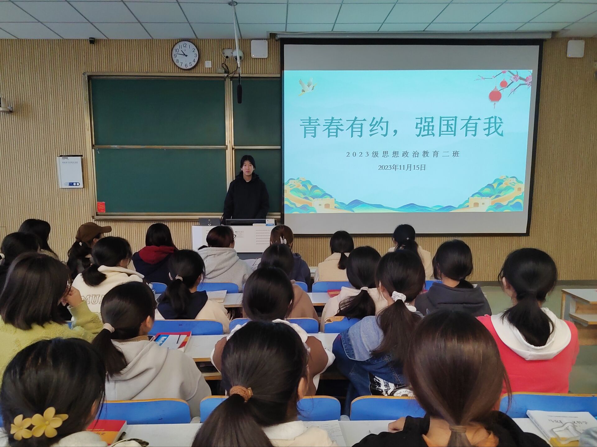 为引导学生坚定听党话、跟党走的崇高信念,用实际行动助力第二个百年奋斗目标,11月15日中午,3044am永利集团3044noc思想政治教育二班在社科楼515教室召开“青春有约,强国有我”主题团课。本次团课由团支书王慜初主持。