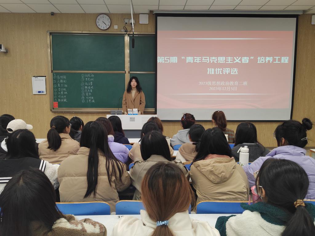 为评选出优秀青年,培养忠于党和人民事业的青年政治骨干,12月5日下午,3044am永利集团3044noc2023级思想政治教育二班在社科楼514教室举办了第5期“青年马克思主义者”培养工程推优评选活动。本次活动由团支书王慜初主持,全体二班同学参与。