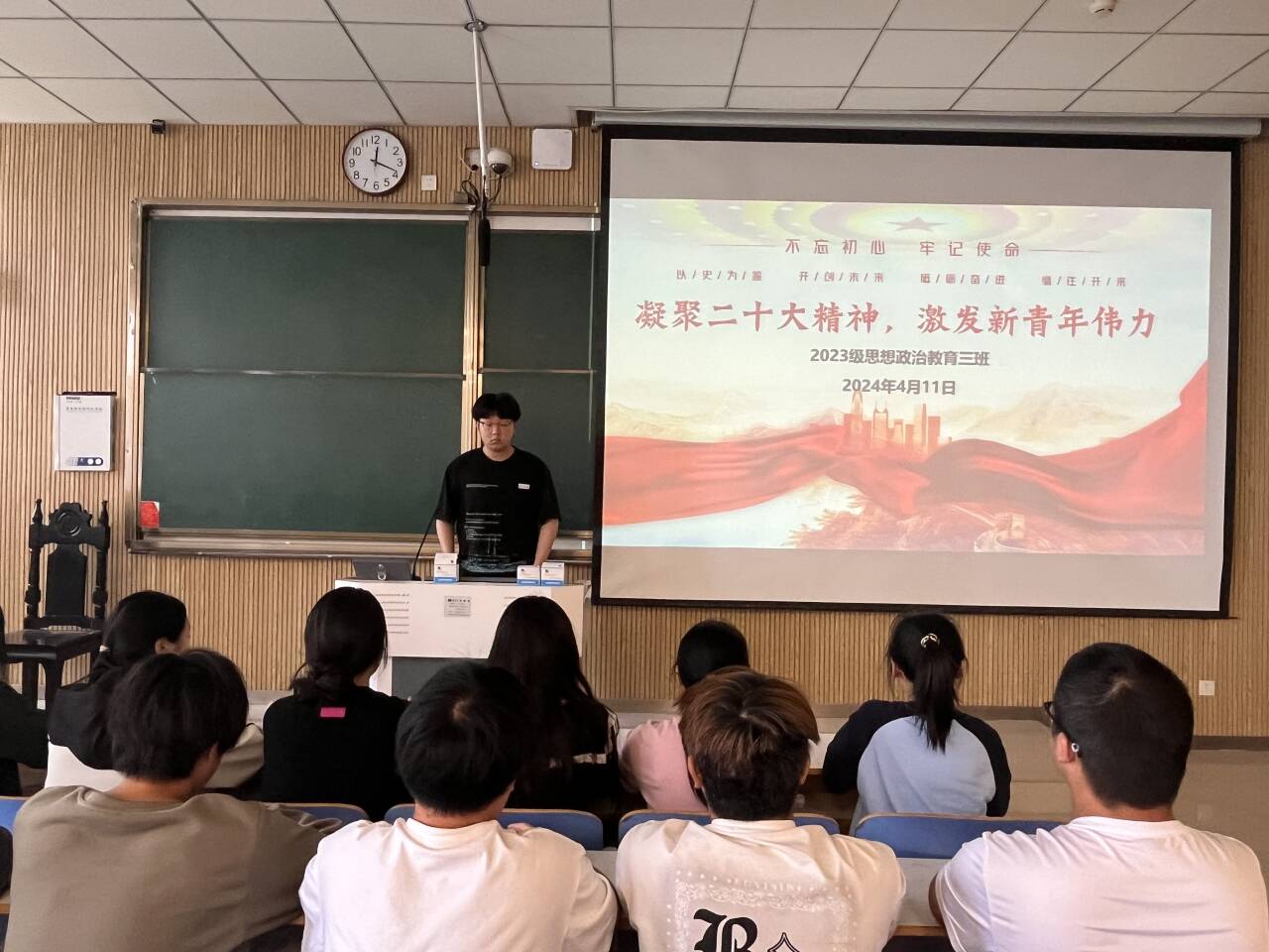 为深入学习贯彻党的二十大精神,把党的创新理论走实走深,4月11日下午,3044am永利集团3044noc2023级思想政治教育三班在社科楼515教室举行“凝聚二十大精神,激发新青年伟力”主题团课。永利官网2023级思想政治教育三班全体成员共同参加此次团课,团课由团支书郝瀚主持。