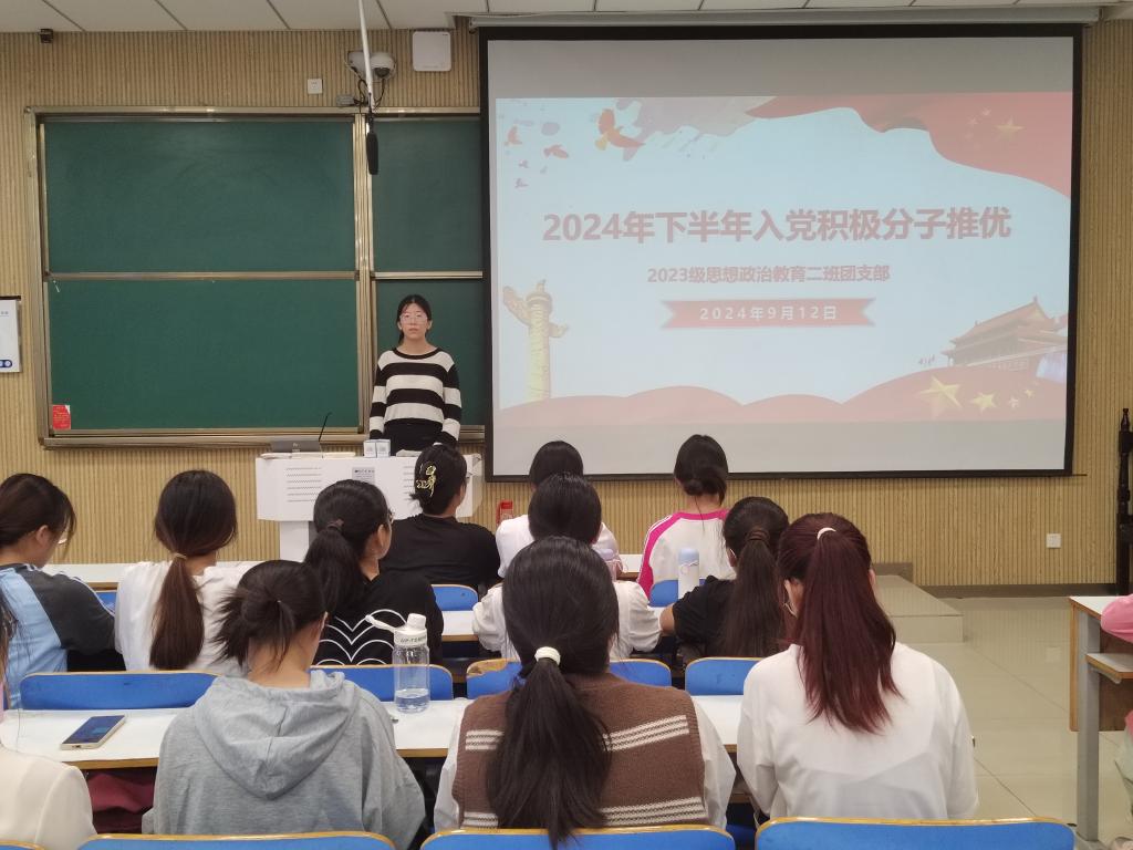 为协助党组织吸纳优秀学生,为党组织增添新活力,9月12日上午,3044am永利集团3044noc2023级思想政治教育二班在社科楼515教室开展2024年下半年入党积极分子推优大会。本次推优大会由团支书王慜初主持,全体二班同学参加。