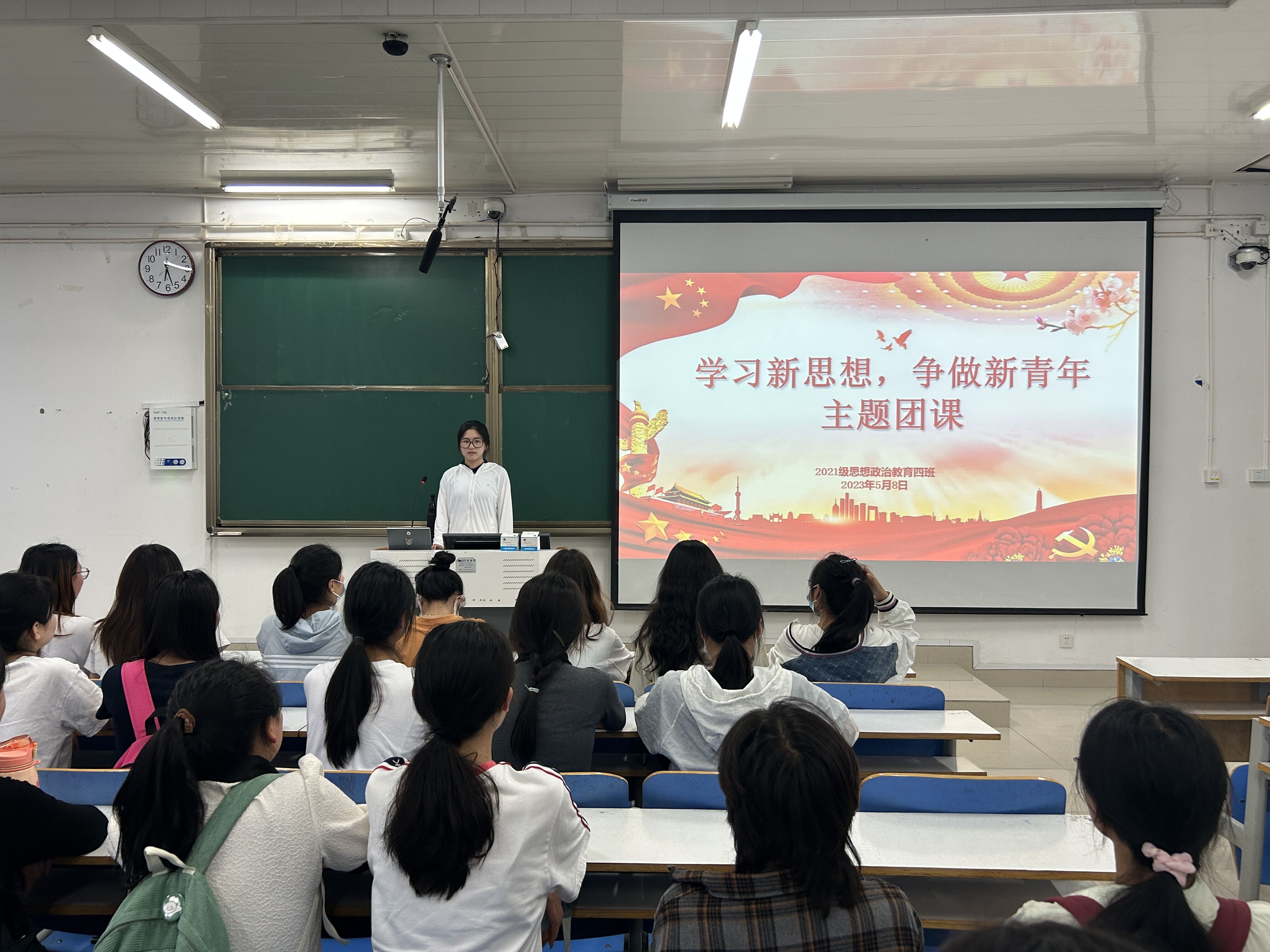 5月8日下午,3044am永利集团3044noc2021级思想政治教育四班在社科楼514教室开展“学习新思想,争做新青年”主题团课。2021级思想政治教育四班全体团员参加本次团课。团课由团支书刘珂含主持。