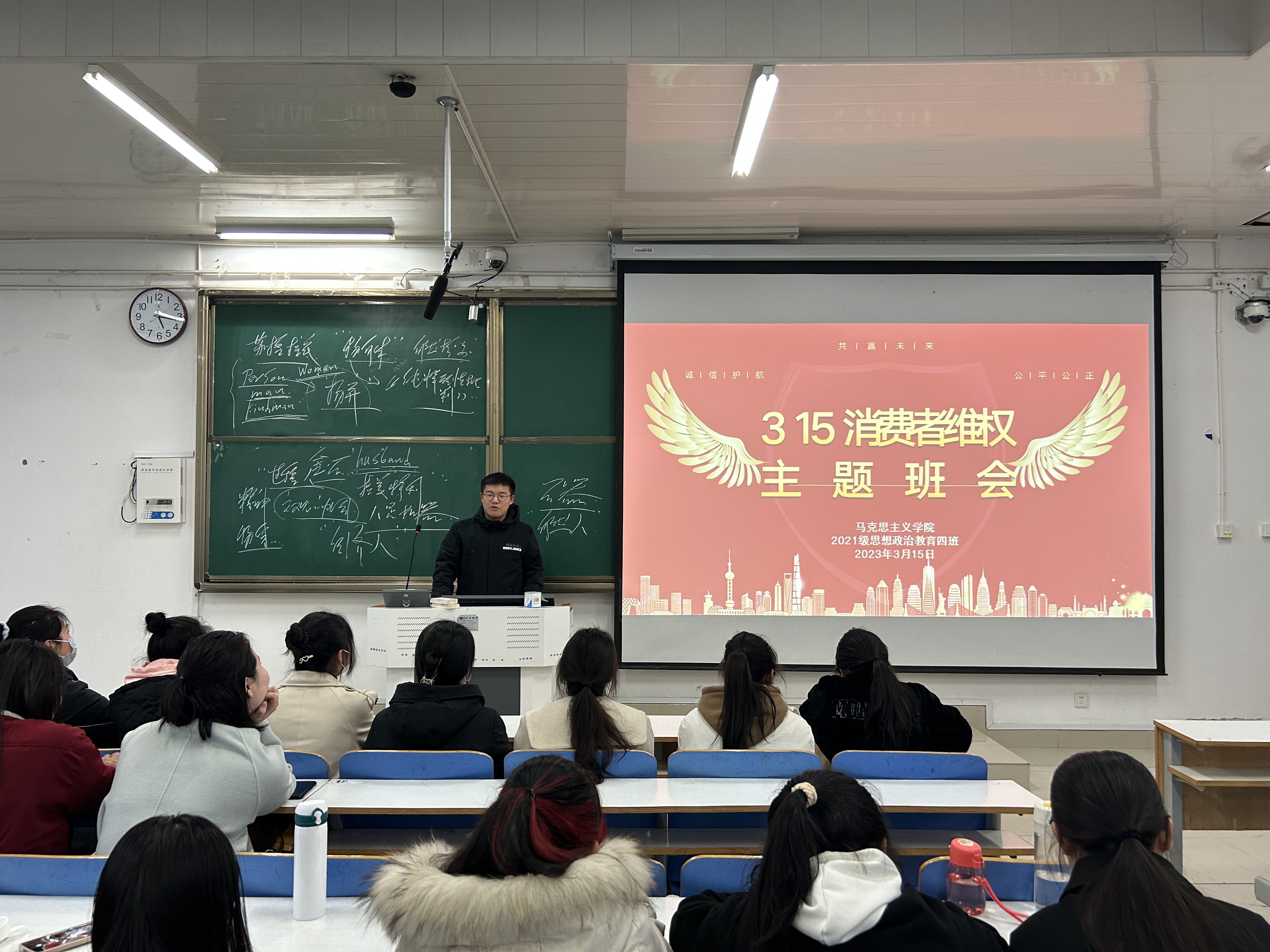 为了扩大消费者权益保护的宣传,提高我班同学维权意识和能力,3月5日下午,3044am永利集团3044noc2021级思想政治教育四班在社科楼514教室开展“315消费者维权”主题班会。2021级思想政治教育四班全体成员共同参会,会议由副班长常康哲主持。