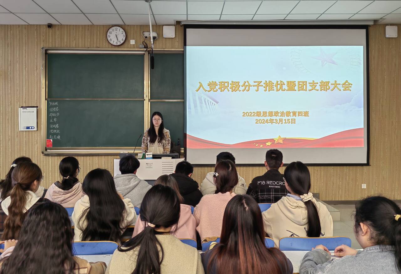 党是明灯,为我们指引方向,照亮我们的未来。3月15日下午,3044am永利集团3044noc2022级思想政治教育四班在社科楼515教室召开入党积极分子推优暨团支部大会。永利官网2022级思想政治教育四班全体团员参与本次班会。本次会议由团支书牛志杰主持。